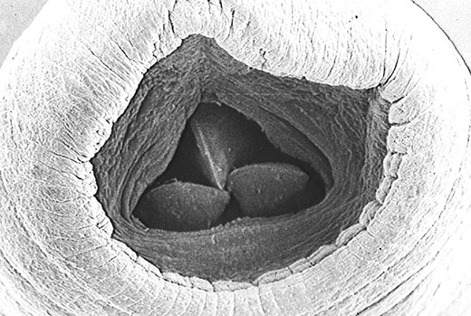 Körper und Nervensystem des Blutegels sind streng segmentiert. Die 33 Segmente (Abschnitte) des Körpers sind über die Gesamtlänge des Blutegels ähnlich aufgebaut. An beiden Körperenden besitzen Blutegel einen Saugnapf. Am Kopfende bildet der Saugnapf die Mundöffnung mit drei darin liegenden Chitin-Zähnen (Abbildung 1), während der größere Saugnapf am Hinterende ausschließlich zur Fortbewegung dient.