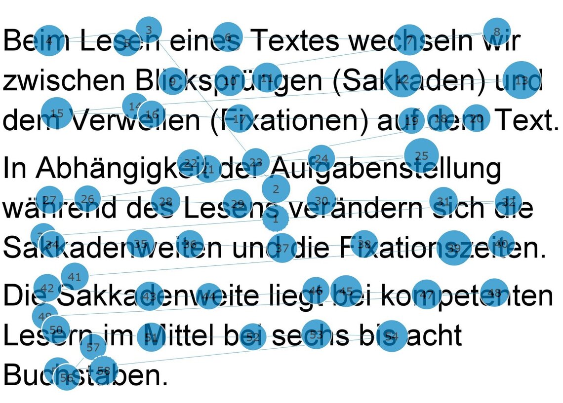 Ein klassisches Bild aus Sakkaden und Fixationen entsteht beim Lesen eines Textes (Abbildung 8). Die Sakkadenlänge ist in dem Fall relativ einheitlich und umfasst rund 8 Buchstaben. Die Sakkaden springen in der Regel von links nach rechts, außer wir lesen eine Stelle wiederholend. Beim Betrachten von Szenen sind die Augenbewegungen freier und es ist offen, in welcher Reihenfolge die verschiedenen Bereiche eines Bildes betrachtet werden.