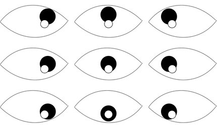 Die Reflexion bewegt sich abhängig von der Ausrichtung des Auges und wird vom Eyetracker in Abhängigkeit zur Pupille verrechnet (Abbildung 9). In der Regel nutzt der Eyetracker Infrarotlicht, um die Reflexion zu induzieren. Infrarotlicht bietet den Vorteil, dass es die Versuchsperson einerseits nicht stört und andererseits durch den Eyetracker von anderen Lichtquellen unterschieden werden kann, indem die Reflexion von einer Infrarotkamera aufgezeichnet wird. Für eine exakte Berechnung der Augenposition wird die genaue Relation von Reflexion zur Pupille für jede Versuchsperson zunächst kalibriert. Dazu fixiert die Versuchsperson Punkte auf dem Bildschirm, die den neun Blickrichtungen in Abbildung 9 entsprechen.