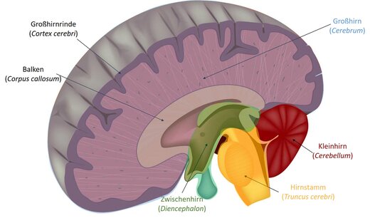 Das Großhirn (Cerebrum) ist durch eine deutliche Fissur in eine linke und eine rechte Hälfte (Hemisphäre) geteilt. Die rechte Hemisphäre dient der Wahrnehmung für die linke Körperhälfte und umgekehrt. Zum Informationsaustausch und zur Koordination der beiden Hälften, sind sie über einen dicken Nervenstrang (Balken/Corpus callosum) miteinander verbunden.