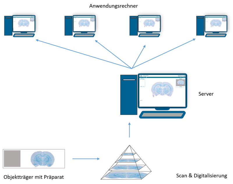 Das System der virtuellen Mikroskopie besteht aus drei Komponenten: einem Mikroskopsystem zum Einscannen der Präparate, dem Server und den Anwendungsrechnern (Client) (Abbildung 1). Das Mikroskopsystem zum Einscannen der Objektträger bildet die Grundlage zur Erstellung der virtuellen Präparate. Das Originalpräparat wird dabei in mehreren hundert Einzelbildern vom Scanner erfasst. Diese werden anschließend mosaikartig zu einem Gesamtbild zusammengesetzt („stitching“). Mit dieser Methode kann das Gesamtpräparat in hoher Auflösung digital zur Verfügung gestellt werden. Dazu wird die zweite Komponente des Systems benötigt. Dieser Server dient zur Speicherung der digitalisierten Präparate und ermöglicht deren Bereitstellung. Die Speicherung der hoch aufgelösten Aufnahmen erfolgt in einer pyramidalen Dateistruktur mit multiplen Vergrößerungen. Der Anwendungsrechner fordert vom Server die Bildausschnitte an, die während der Betrachtung angefragt werden. Diese Anzeige erfolgt über die programmierte Bildbetrachtungssoftware des virtuellen Mikroskops.