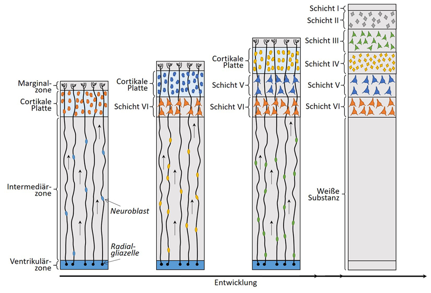 Die Großhirnrinde wird während der Entwicklung des Embryos schichtweise von der Ventrikulärzone eines Vesikels her aufgebaut (Abbildung 7). Dabei entstehen zuerst die inneren Schichten der Großhirnrinde. Die aufeinander aufbauende Anlagerung der Schichten, erfolgt mit Hilfe radialer Gliazellen. Diese entstehen durch symmetrische Teilung von Stammzellen der Ventrikulärzone und bilden lange Fortsätze, die senkrecht zur Schichtung des Gehirns nach außen wachsen und als eine Art Gerüst für die Zellwanderung dienen. Teilt sich eine Stammzelle asymmetrisch, kommt es zur Bildung der Neuroblasten, die nun entlang der radialen Gliazellen nach außen wandern und zunächst eine kortikale (den Cortex betreffend) Platte bilden. Aus der ersten kortikalen Platte entsteht durch Zelldifferenzierung nun die innerste Schicht der Großhirnrinde (VI). Dabei differenzieren sich aus den ankommenden Neuroblasten zunächst die Nervenzellen und dann die Gliazellen. Anschließend wandern weitere Neuroblasten an dieser Schicht vorbei und bilden eine neue kortikale Platte. Dieser Prozess wiederholt sich, bis alle sechs Schichten der Großhirnrinde ausdifferenziert sind. Wenn der Aufbau beendet ist, können sich die Fortsätze der Radialgliazellen zurückbilden.