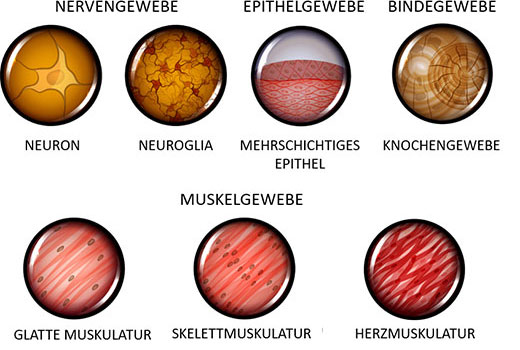 Im Organismus treten Zellen jedoch selten isoliert auf, sondern meistens im Verband von mehreren Zellen des gleichen Typs. Einen solchen Zusammenschluss von Zellen mit gleichen Merkmalen oder Spezialisierungen nennt man Gewebe. Die Gewebe wiederum bilden abgegrenzte Funktionseinheiten, die Organe. Bei Tieren lassen sich die vier Grundgewebetypen Epithel-, Binde-, Muskel-, und Nervengewebe unterscheiden. Die Zellen des Epithelgewebes liegen dicht beieinander, grenzen den Körper nach außen ab und kleiden die Körperhohlräume aus. Dazu zählt beispielsweise die Haut oder die Schleimhaut des Magens. Die unverbundenen Zellen des Bindegewebes werden von einer extrazellulären Matrix (netzartiger Verband) umgeben, die